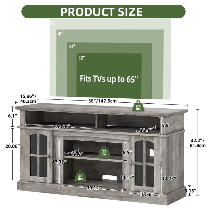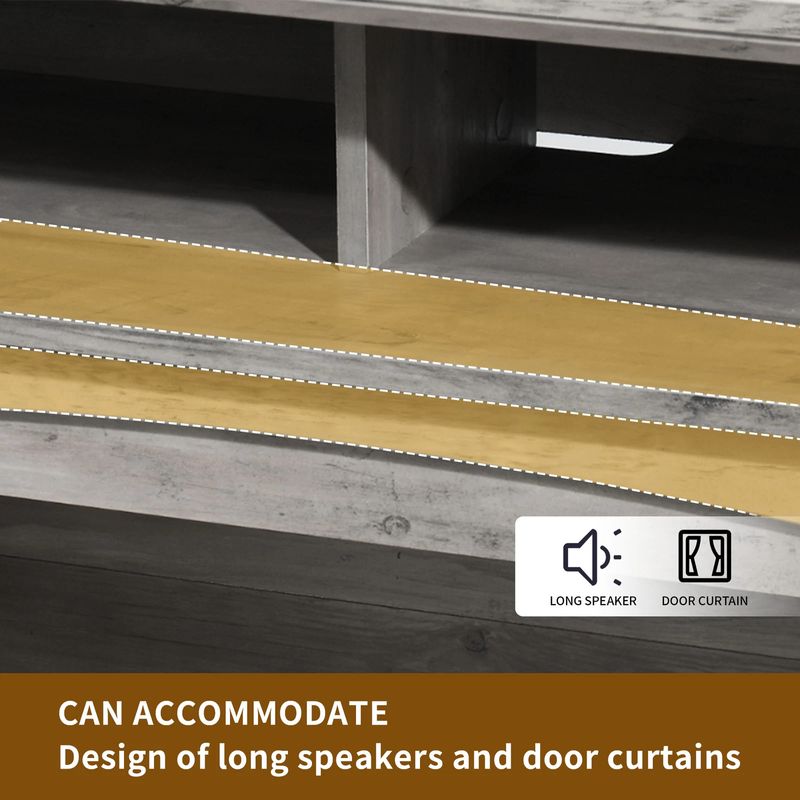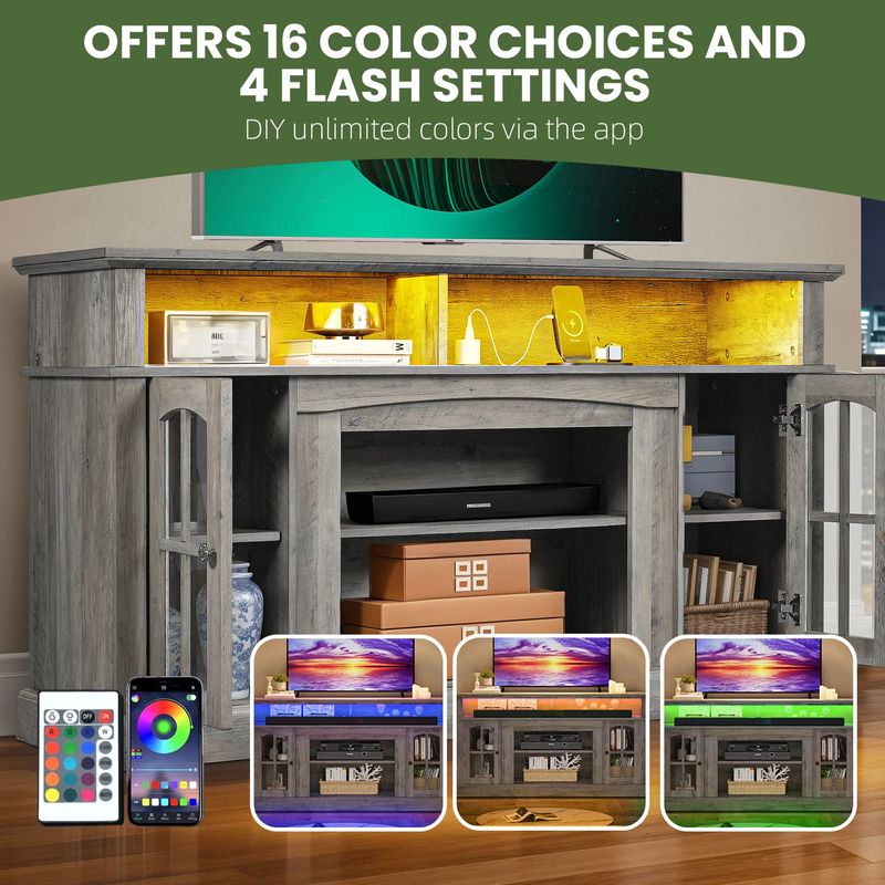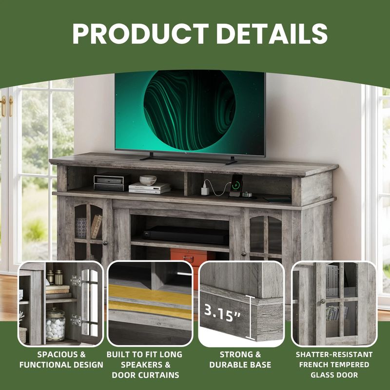 Upgrade your living room with this modern LED Farmhouse TV Stand for 65-inch TVs. Features convenient outlets, glass doors, and adjustable shelves for versatile storage. A stylish media console that combines functionality with rustic charm. Perfect for organizing your entertainment essentials!