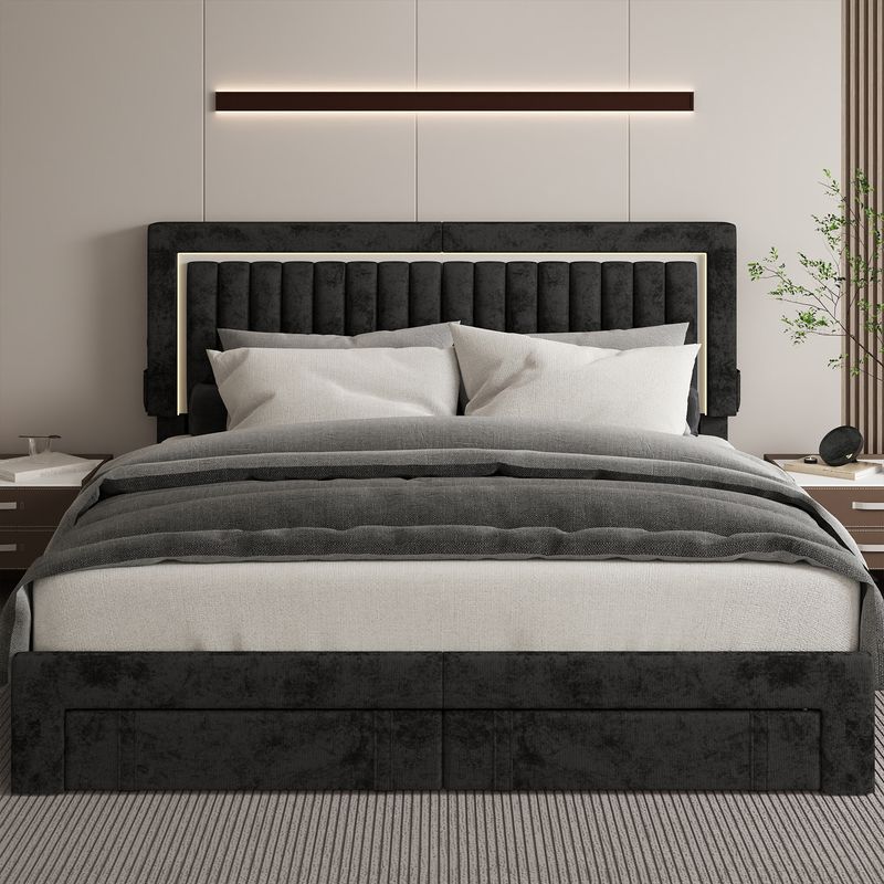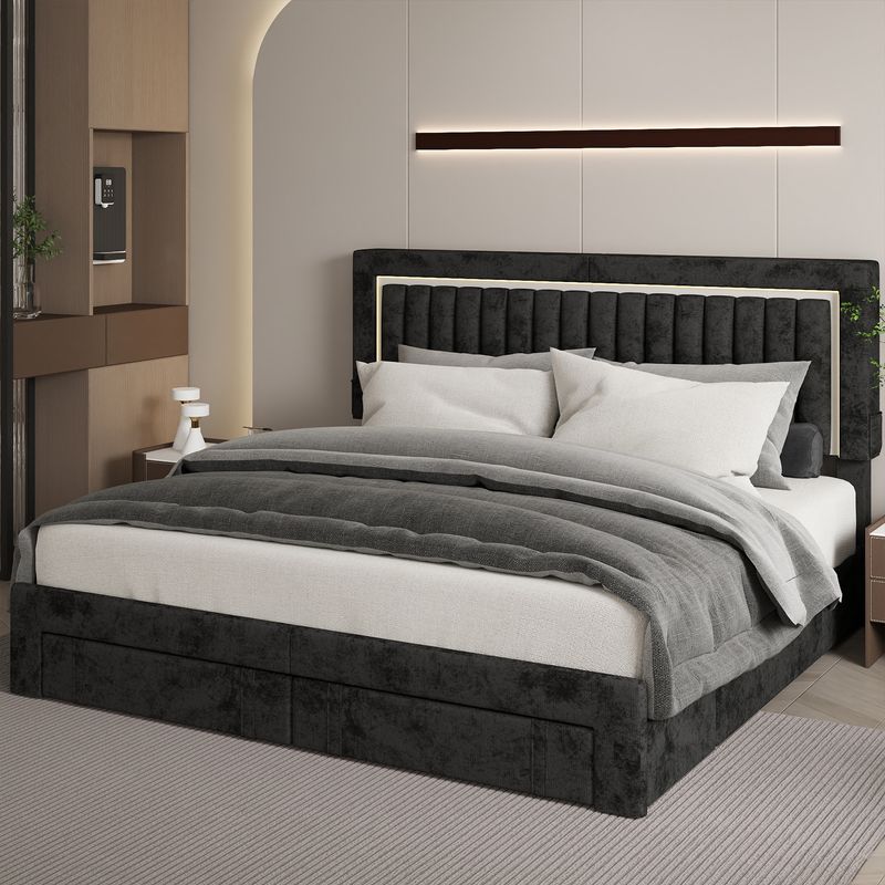 Upgrade your bedroom with this luxurious king-size velvet bed frame. Features an adjustable headboard, 4 spacious storage drawers, and vibrant RGB LED lights for ambiance. Includes USB ports, requires no box spring, and offers fast, tool-free assembly. The sturdy platform design ensures noise-free comfort for a perfect night's sleep.
