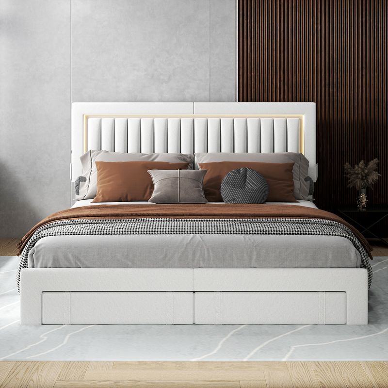 Upgrade your bedroom with this luxurious king-size velvet bed frame. Features an adjustable headboard, 4 spacious storage drawers, and vibrant RGB LED lights for ambiance. Includes USB ports, requires no box spring, and offers fast, tool-free assembly. The sturdy platform design ensures noise-free comfort for a perfect night's sleep.