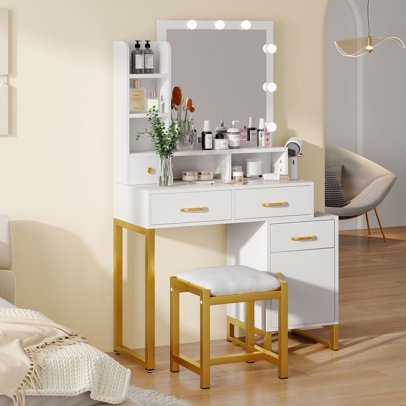 White Makeup Vanity Sets with Smart Lighted Mirrors, Drawers, Storages & Chair