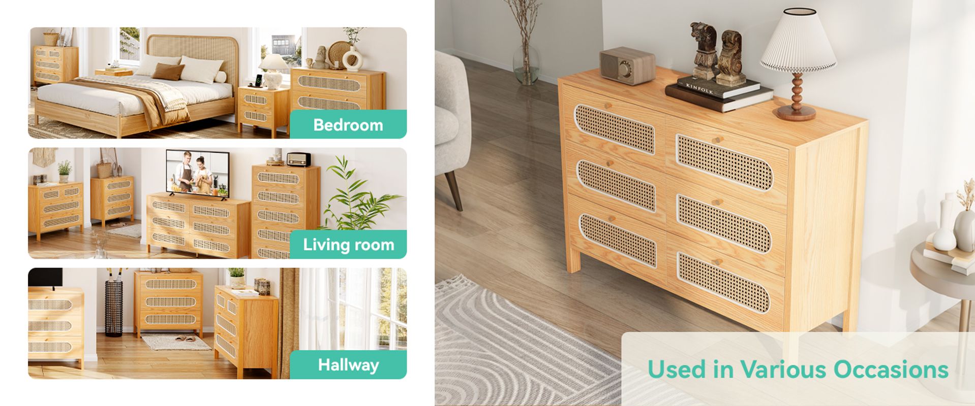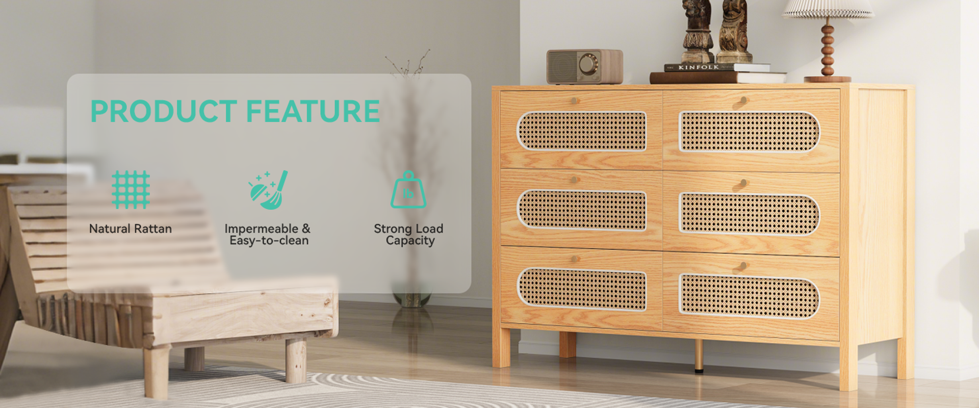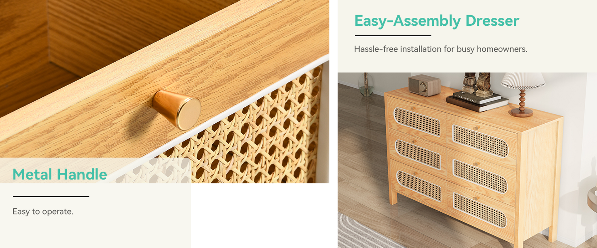 Discover our chic 6-drawer chest featuring natural wicker fronts and modern metal handles. Crafted from premium MDF, this easy-to-clean piece boasts a minimalist design that harmonizes with any decor. Effortless assembly ensures quick setup, offering both style and functionality.