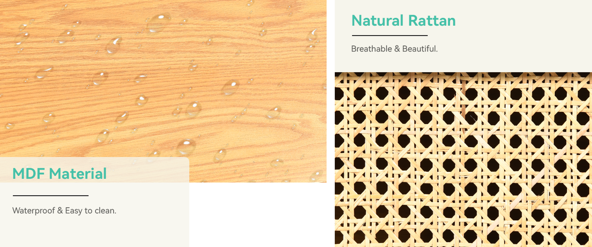 Enhance your space with rustic charm using natural wicker fronts on each drawer for added texture and style.