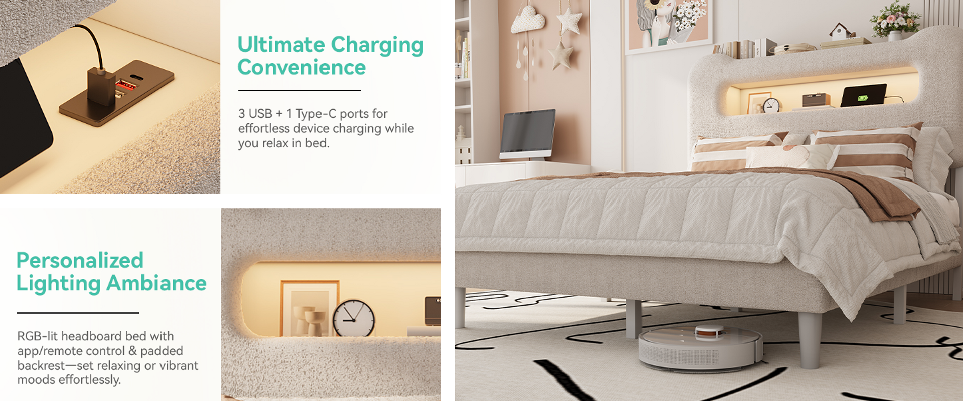 RGB-lit headboard bed with app/remote control & padded backrest—set relaxing or vibrant moods effortlessly.