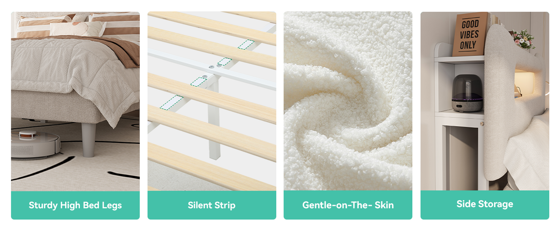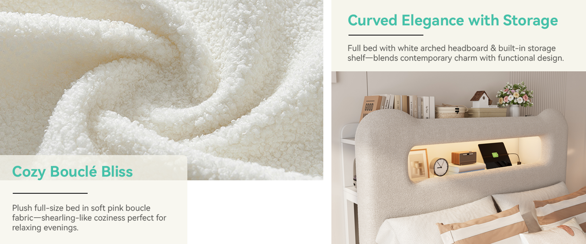 white boucle bed frame, full size bed frame with headboard, full size bed frame, full size bed frame with storage, white bed frame, white full bed frame, white full size bed frame​, white bed frame with storage