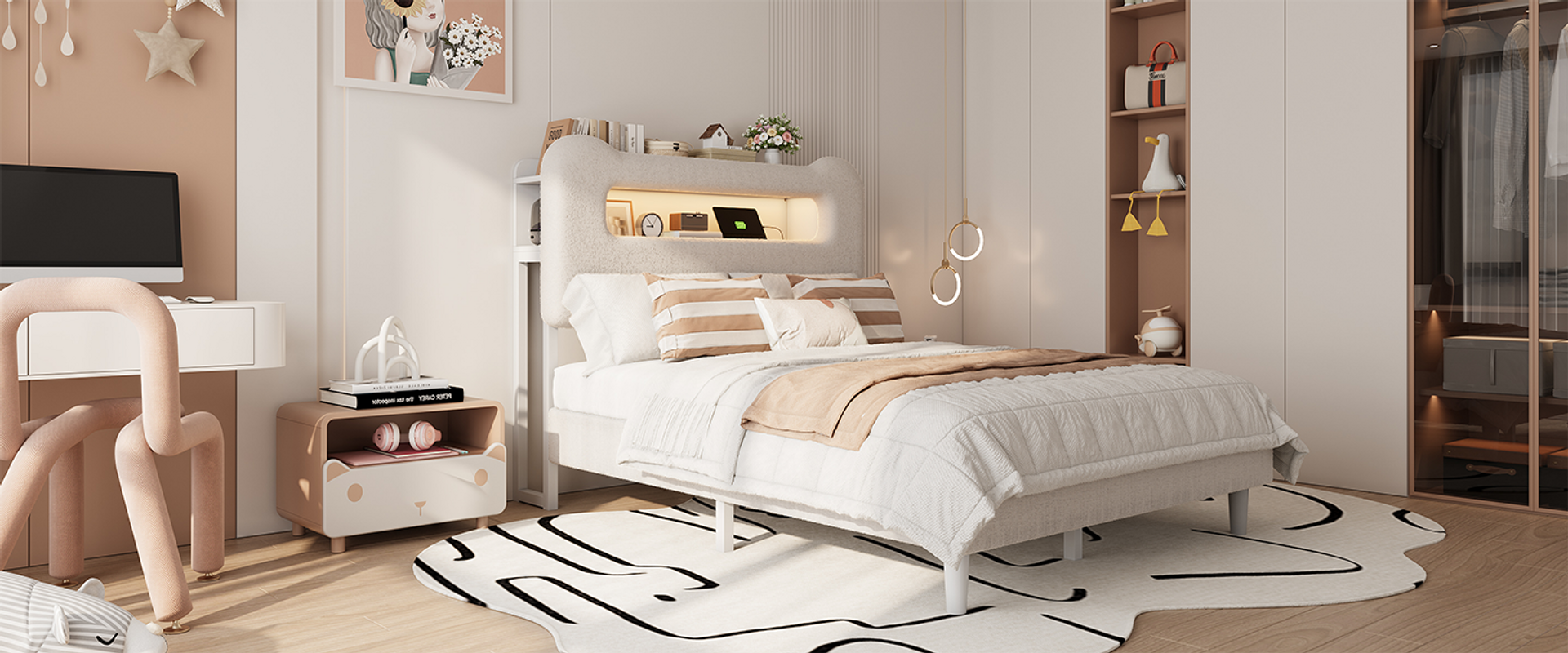 Full bed with pink arched headboard & built-in storage shelf—blends contemporary charm with functional design.