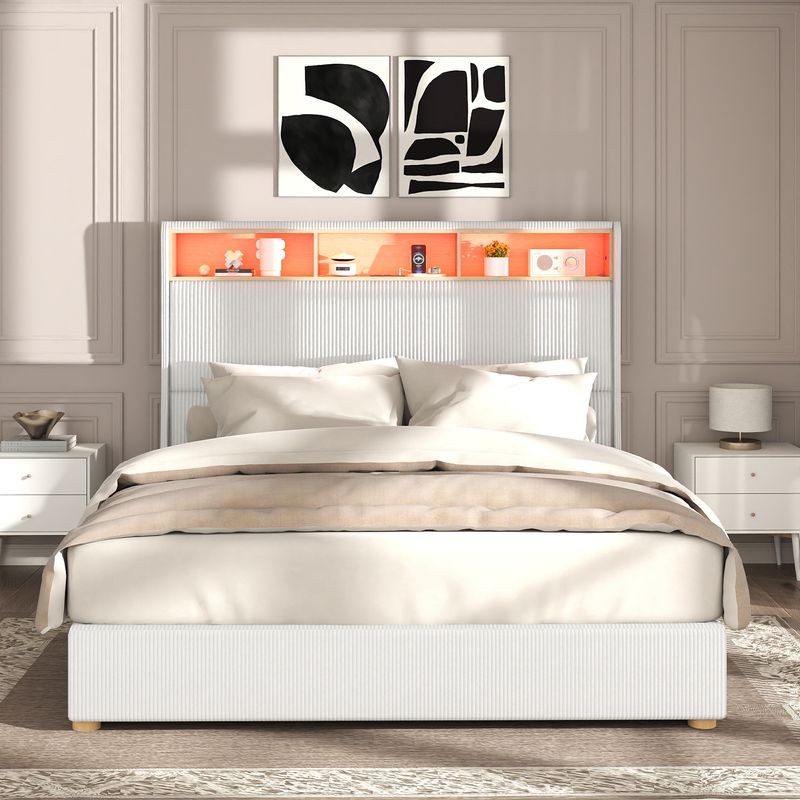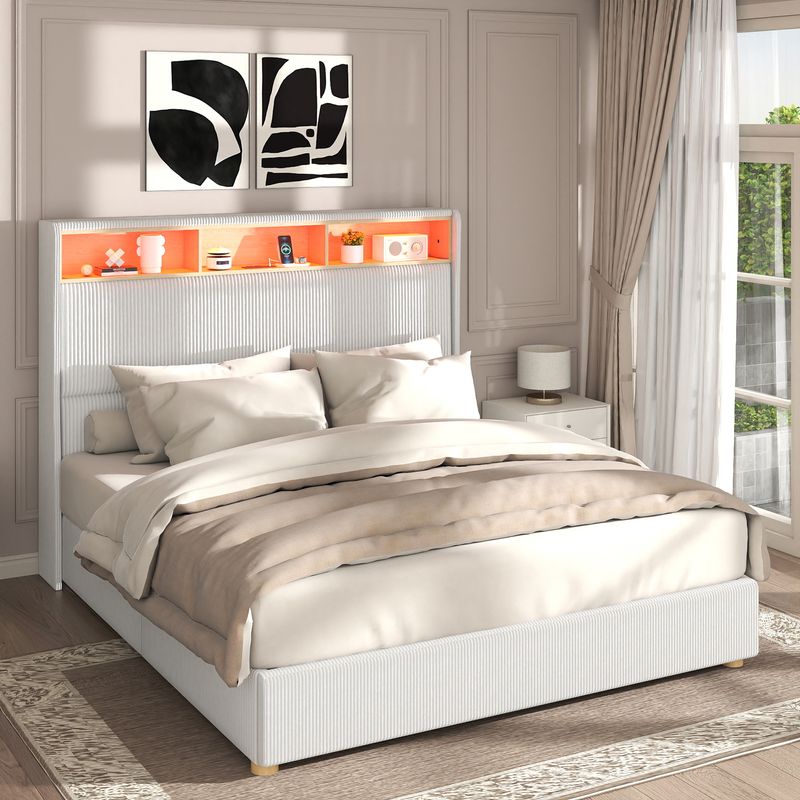 Upgrade your bedroom with this stylish Queen Size Corduroy Upholstered Platform Bed Frame! Features a 53" tall wingback headboard with storage, built-in USB charging station, and RGB LED lights for a modern touch. No box spring needed—enjoy sturdy support and noise-free comfort.