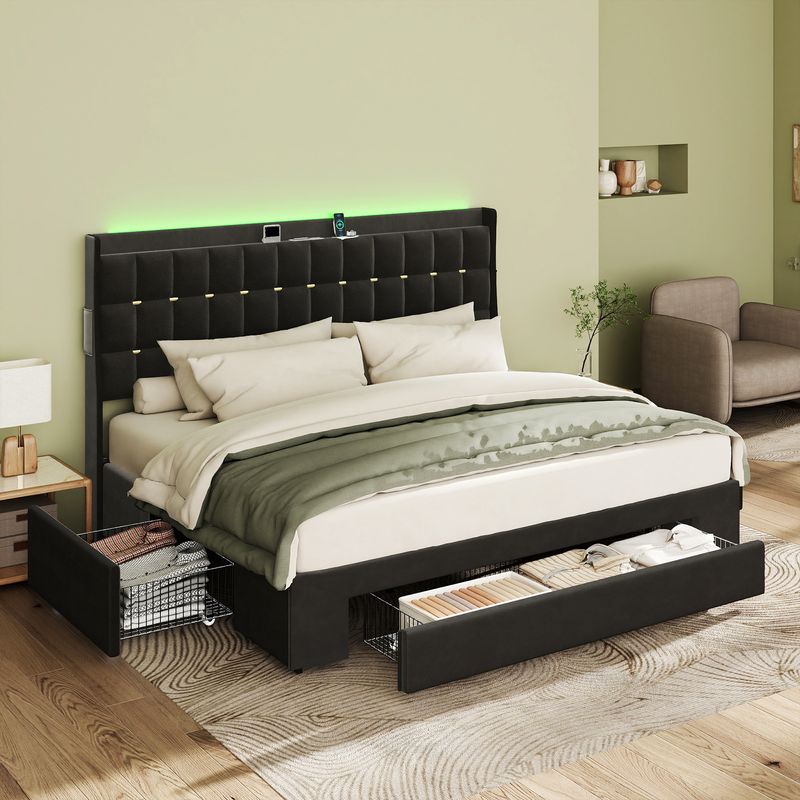 Upgrade your bedroom with this king-size velvet bed frame. Features 3 storage drawers, RGB LED lights, a charging station, and a spacious headboard for ultimate organization and modern style.