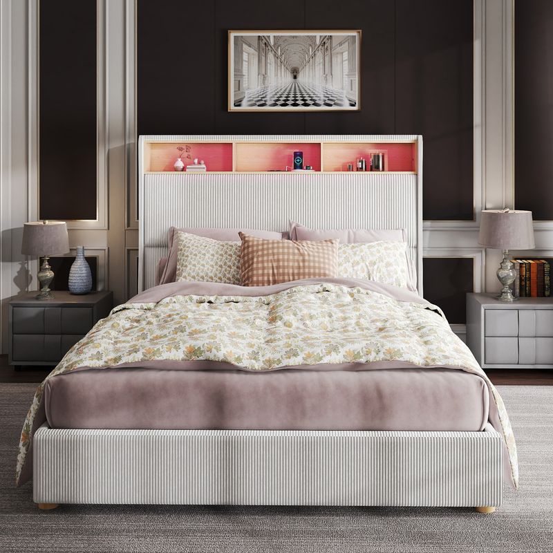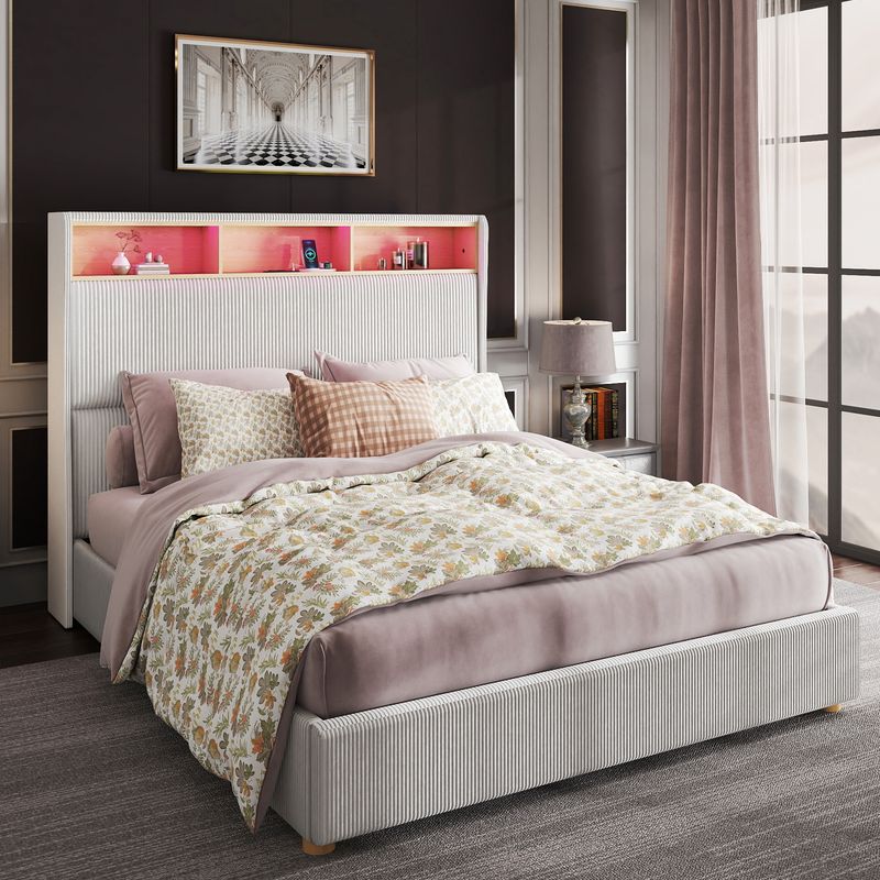 Upgrade your bedroom with this stylish Queen Size Corduroy Upholstered Platform Bed Frame! Features a 53" tall wingback headboard with storage, built-in USB charging station, and RGB LED lights for a modern touch. No box spring needed—enjoy sturdy support and noise-free comfort.