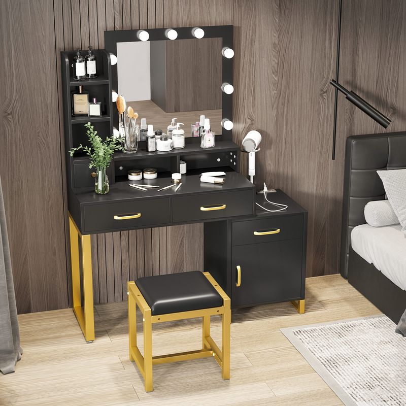 A multi-functional makeup desk that combines 2 standard plug sockets, 2 USB ports, and 1 hair dryer rack so your hair dryer, mobile phone, and curling iron can be within arm’s reach; Glam makeup vanity for dressing room, bedroom, salon, or live broadcast