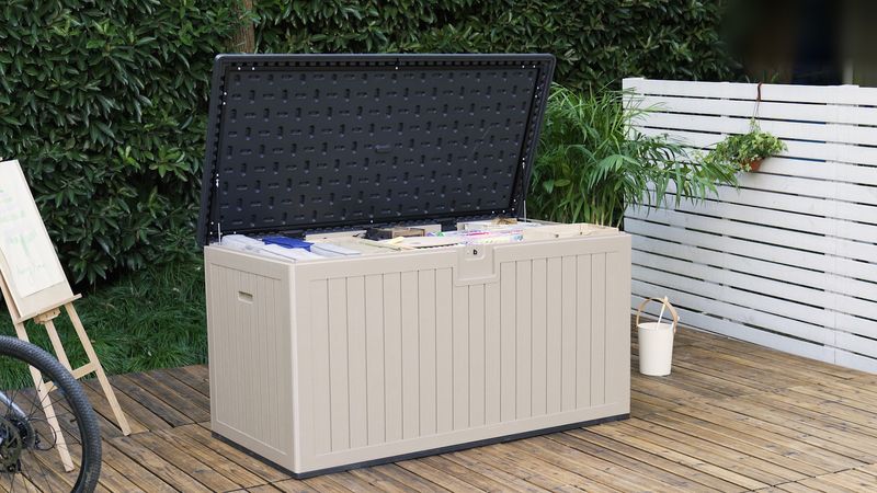 This deck box can blend into any yard or patio to store patio furniture cushions, outdoor toys, gardening tools, pool accessories, etc.; The top layer doubles as an extra table or stool.