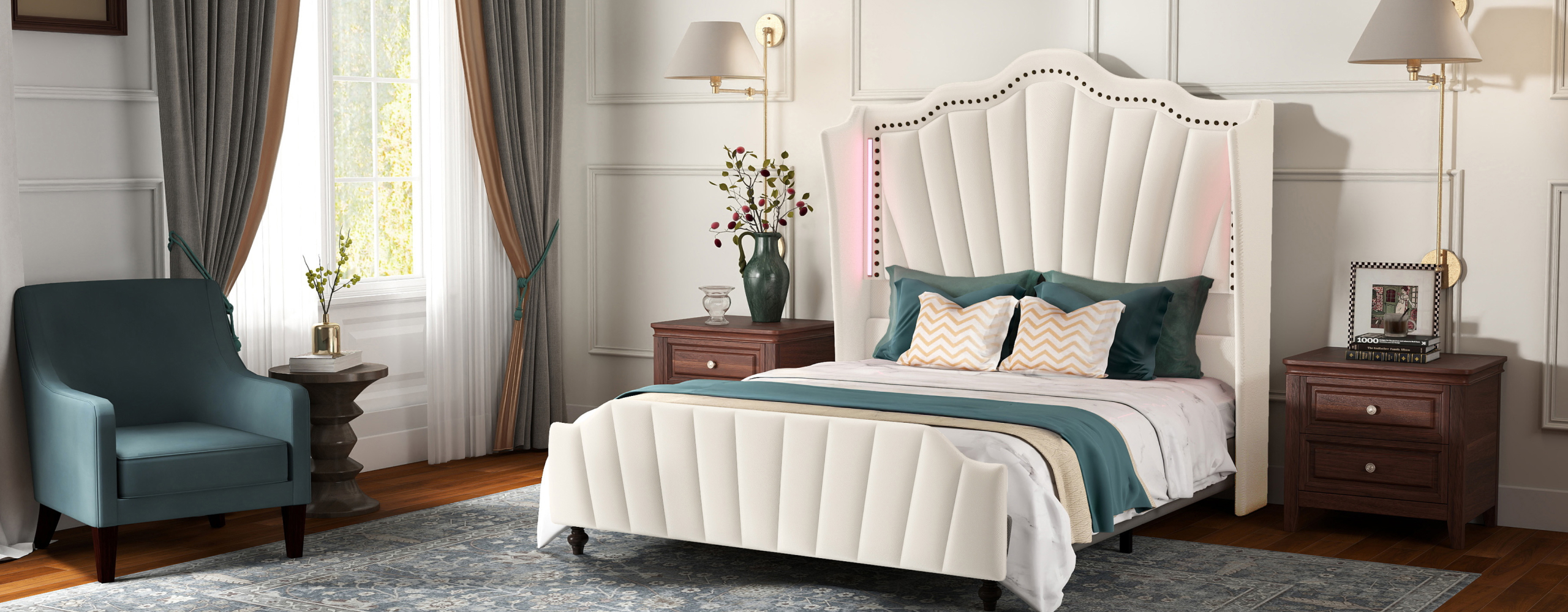 Modern Queen Size Velvet Upholstered Wingback Bed Frame with LED Light