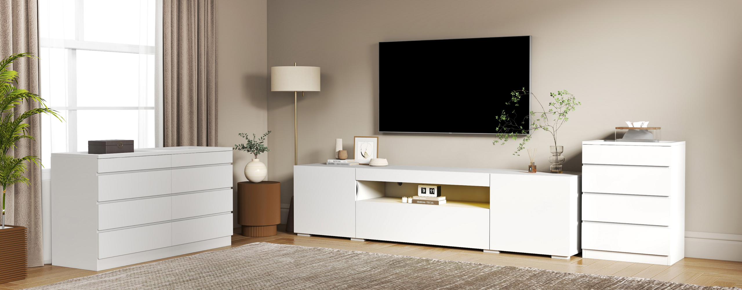 White 8 Drawer Double Dresser with LED Light and Tempered Glass Top High Gloss Surface